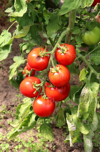 Куст спелых красных болезненных томатов в теплице