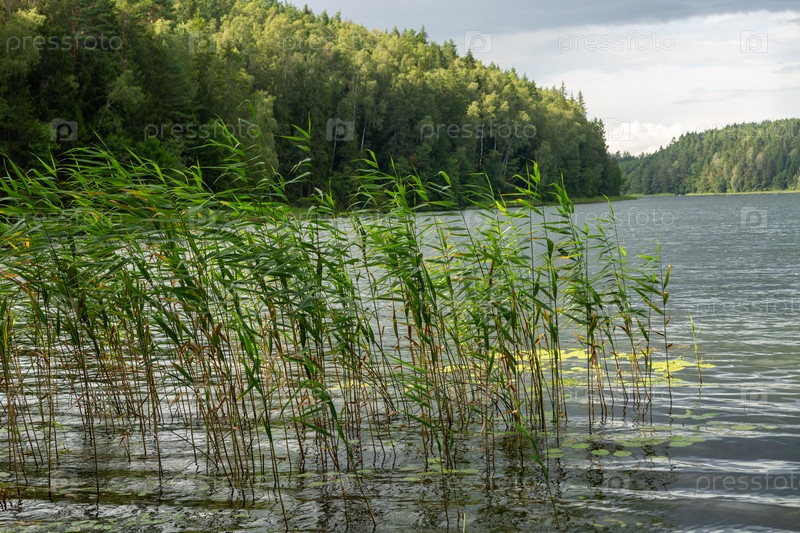 Спокойный пейзаж на берегу озера с пышной лесистой береговой линией и яркой радугой, изгибающейся на облачном небе
