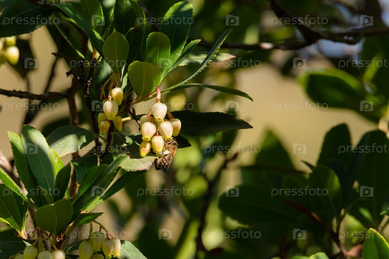 Пчела, сидящая на желтых цветах, окруженных зелеными листьями на солнце, опыляет насекомых на цветах земляничного дерева, Гранада, Андалусия, Испания