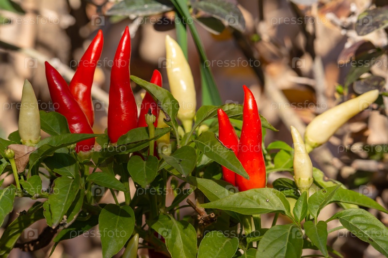 Яркие красные и белые перцы растут среди сочных зеленых листьев в залитом солнцем саду, Гранада, Андалусия, Испания,