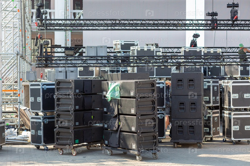 Стебли звукового и светового оборудования расставлены на открытой площадке, готовые к концерту. Металлические рамы и корпуса создают динамичную сцену подготовки мероприятия и технической настройки