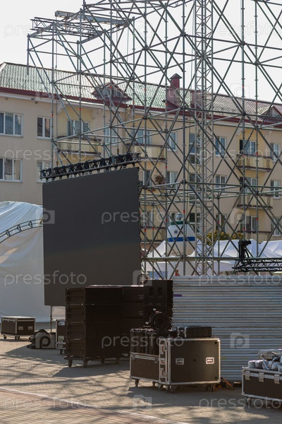 Сценическое оборудование для организации концертных шоу. Ящики с концертным оборудованием: акустика, свет, усилители, светодиодные панели и кабели
