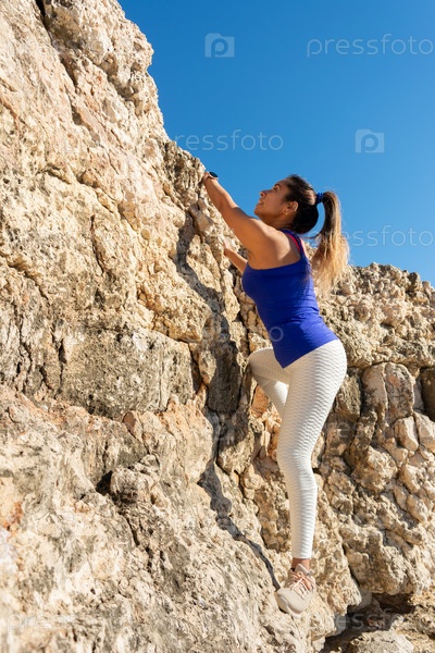 Женщина уверенно взбирается по каменистой поверхности, демонстрируя физическую силу и приключения на свежем воздухе, латиноамериканка, среднего возраста, на открытом воздухе, скалолазание псикоблок на Майорке, Балеарские острова, Испания