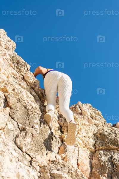 Женщина взбирается на скалу, вид снизу, чистое небо, латиноамериканка, среднего возраста, на открытом воздухе, скалолазание псикоблок на Майорке, Балеарские острова, Испания