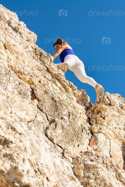 Женщина взбирается на скалистый утес в яркую солнечную погоду, недалеко от вершины, латиноамериканка, среднего возраста, на открытом воздухе, скалолазание псикоблок на Майорке, Балеарские острова, Испания