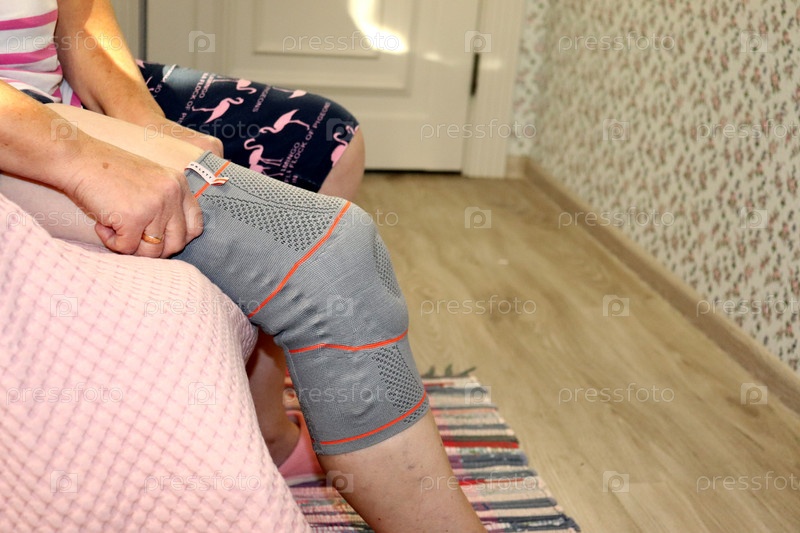 Пожилая женщина сидит с ортезом на ноге - травма колена