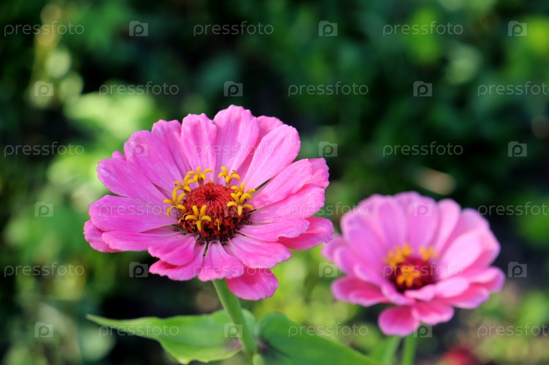Два лиловых цветка цинний на клумбе в саду - крупный план