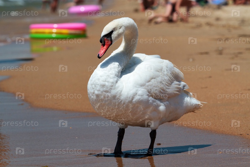 Большой белый лебедь на песчаном пляже