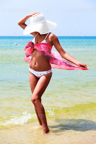 Стройная загорелая женщина позирует на морском пляже