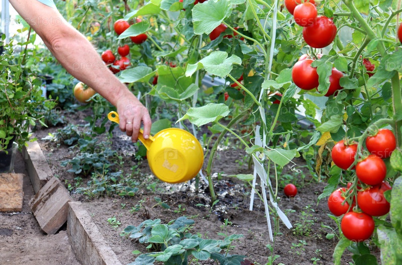 Мужчина поливает кусты томатов в теплице из ковша