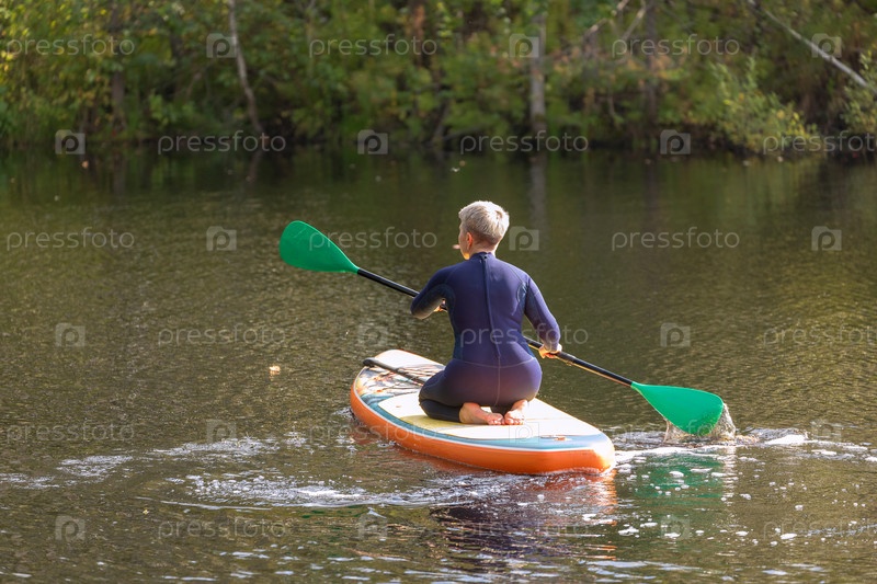 Женщина на доске для серфинга с веслом на поверхности лесного озера или пруда