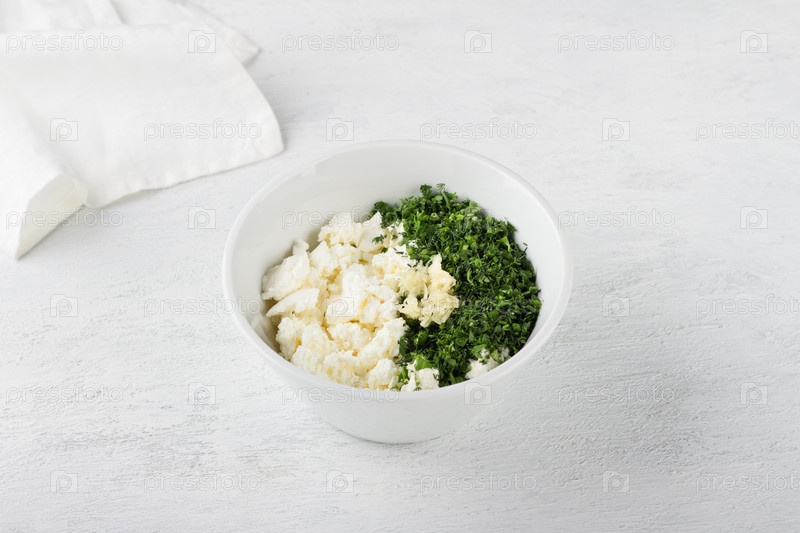Белая миска с творожным кремом, смешанным с зеленью и чесноком на светло-сером фоне. Приготовление закуски или начинки для фаршировки овощей, вегетарианская еда