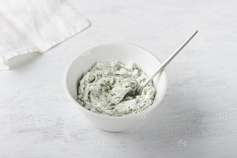 Белая миска с творожным кремом, смешанным с зеленью и чесноком на светло-сером фоне. Приготовление закуски или начинки для фаршировки овощей, вегетарианская еда