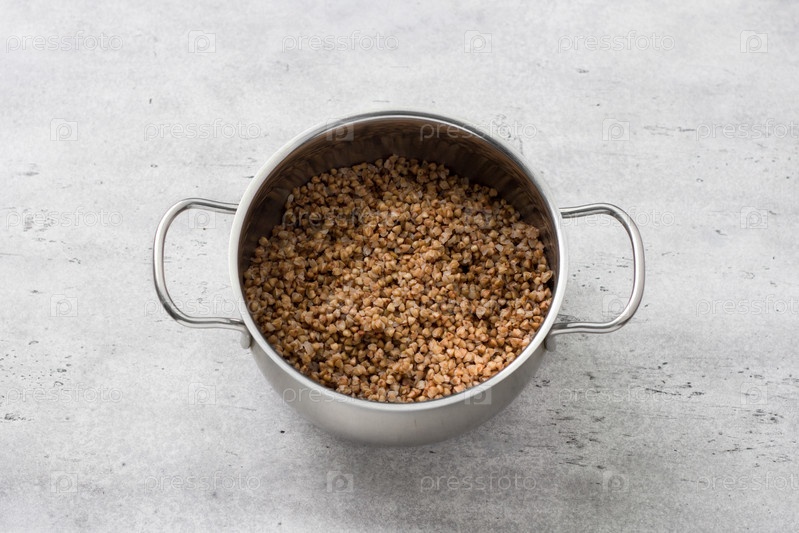 Вареная гречка в кастрюле на сером текстурированном фоне, вид сверху. Готовим вкусную веганскую еду или завтрак