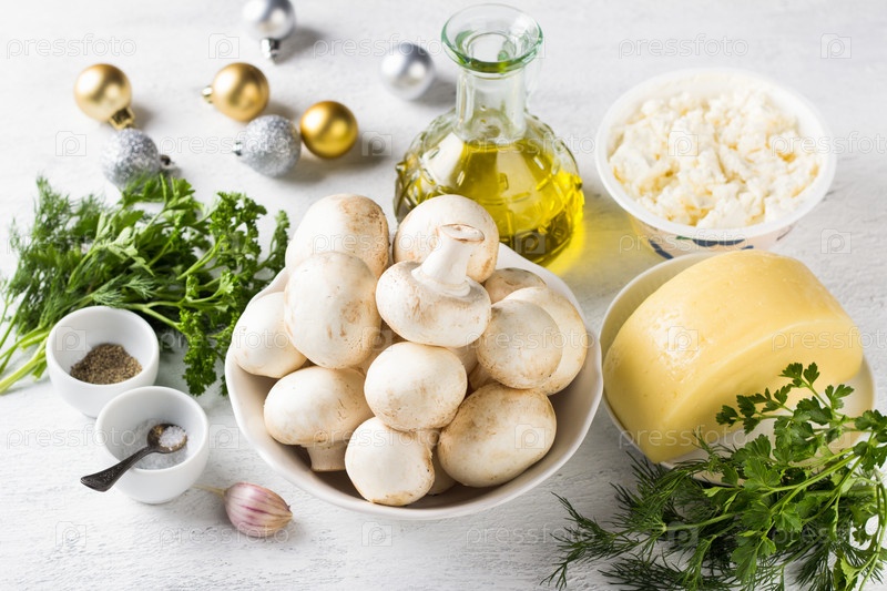 Состав: грибы шампиньоны, сыр твердый, сыр творожный, чеснок, масло оливковое, зелень для сырного рулета. Приготовление праздничной закуски