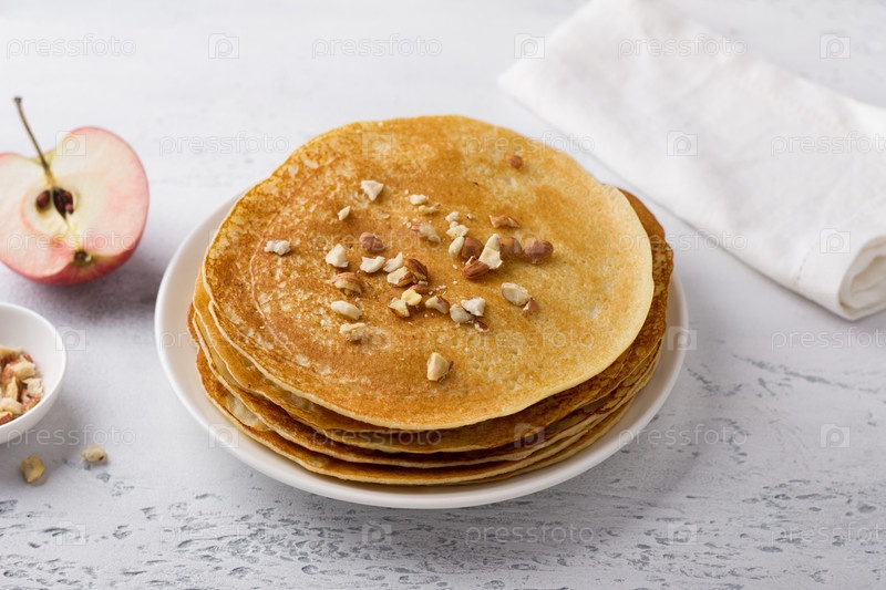 Яблочные блины с орехами на светло-сером фоне, вид сверху. Вкусная домашняя еда