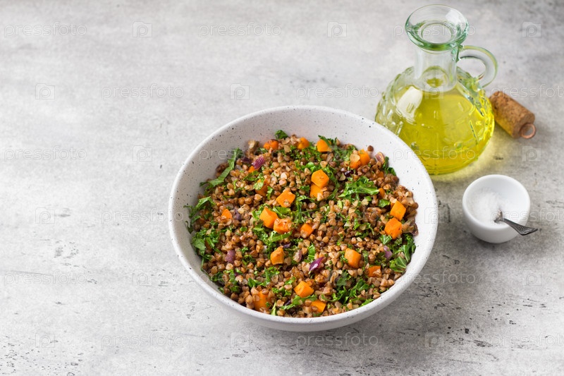 Гречка с овощами и капустой на сером текстурированном фоне, вид сверху. Вкусная здоровая веганская еда