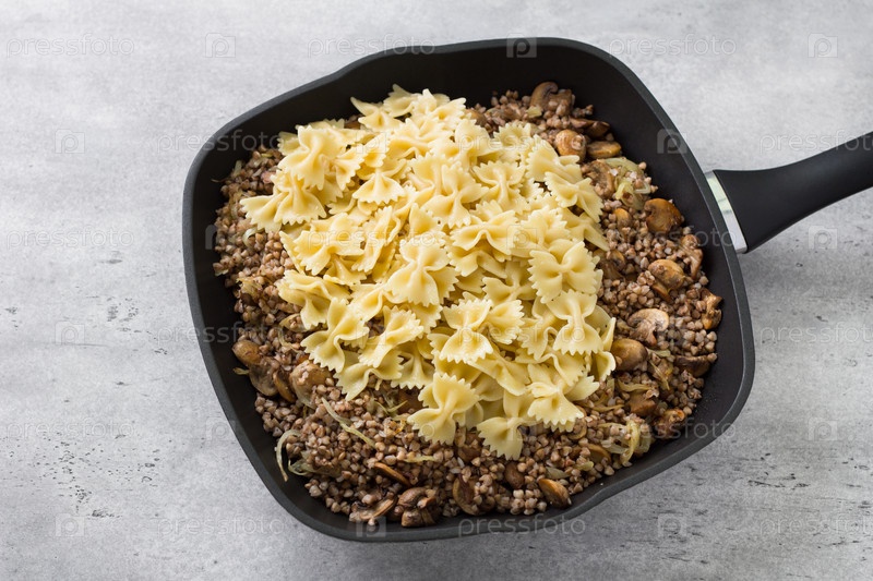 Традиционное еврейское блюдо каша лакиркес: гречка, шампиньоны, жареный лук, паста фарфалле на сковороде на сером текстурированном фоне, приготовление домашней еды, вид сверху