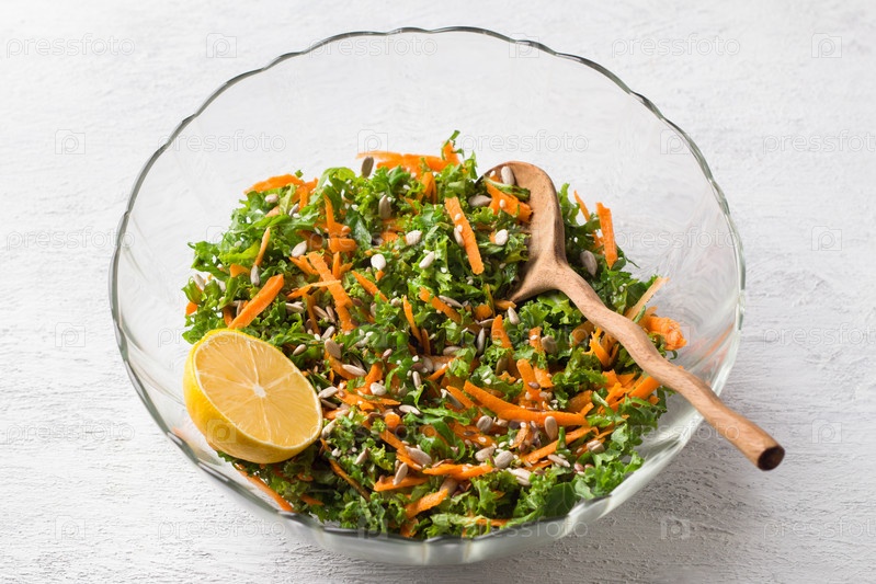 Салат с капустой, морковью и семенами в прозрачной салатнице на светло-сером фоне