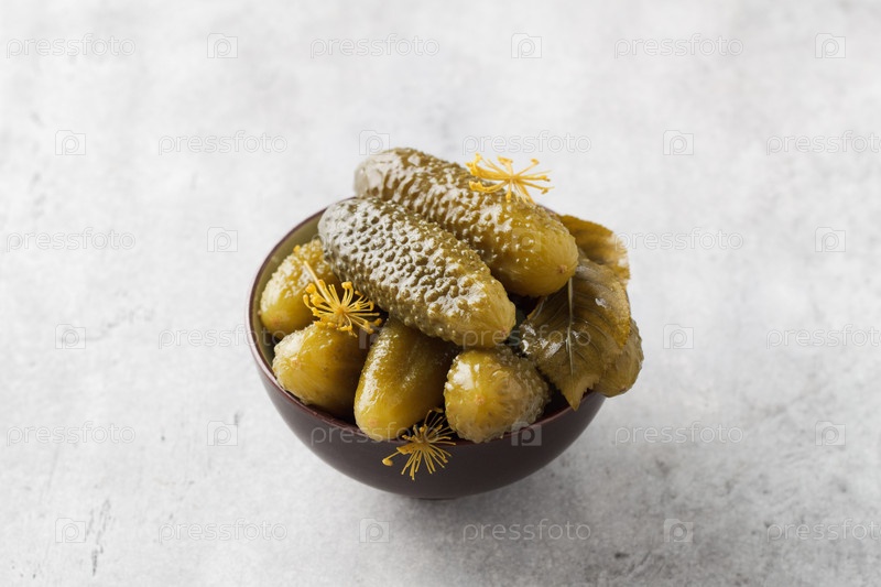 Вкусные домашние маринованные огурцы в коричневой керамической миске на сером фактурном фоне