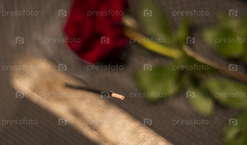 Снимок горящей ароматической палочки и розы на столе. Концепция