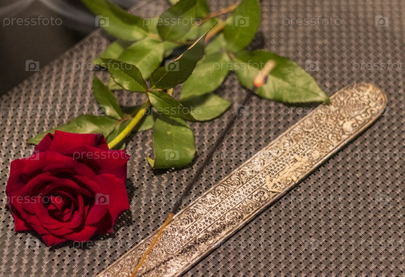 Снимок горящей ароматической палочки и розы на столе. Концепция