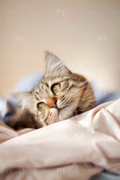 Кошка расслабляется и мечтает на кровати