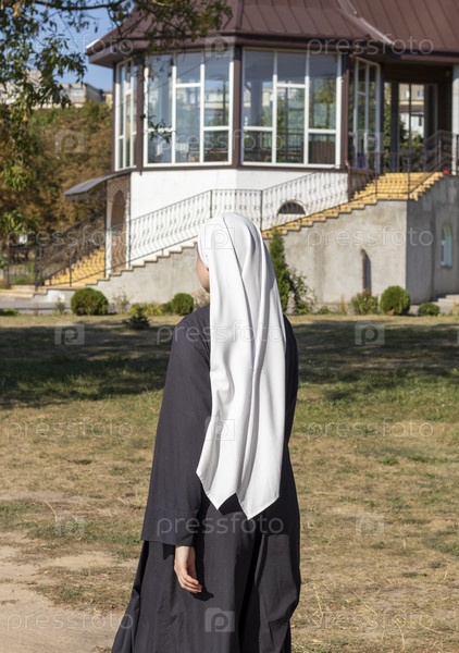 Крупным планом монахиня идет на улице. Концепция
