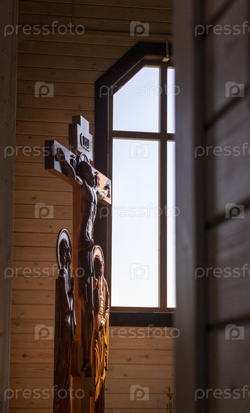 Деревянный крест с Иисусом в христианской церкви. Религия