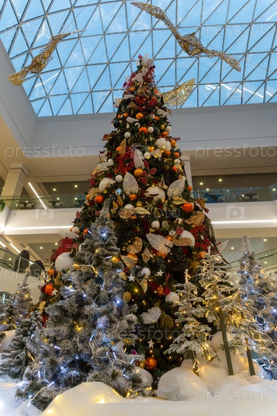 Изображение большой украшенной рождественской елки в торговом центре. Торговый центр привлекает посетителей возможностью сделать красивые фотографии на фоне пейзажа