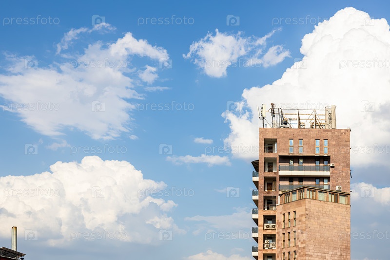 Белые облака в синем небе и башни городского дома
