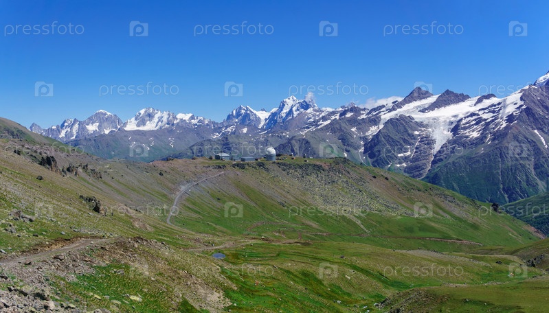 Горный пейзаж с альпийским лугом, обсерваторией вдалеке и горными вершинами на заднем плане