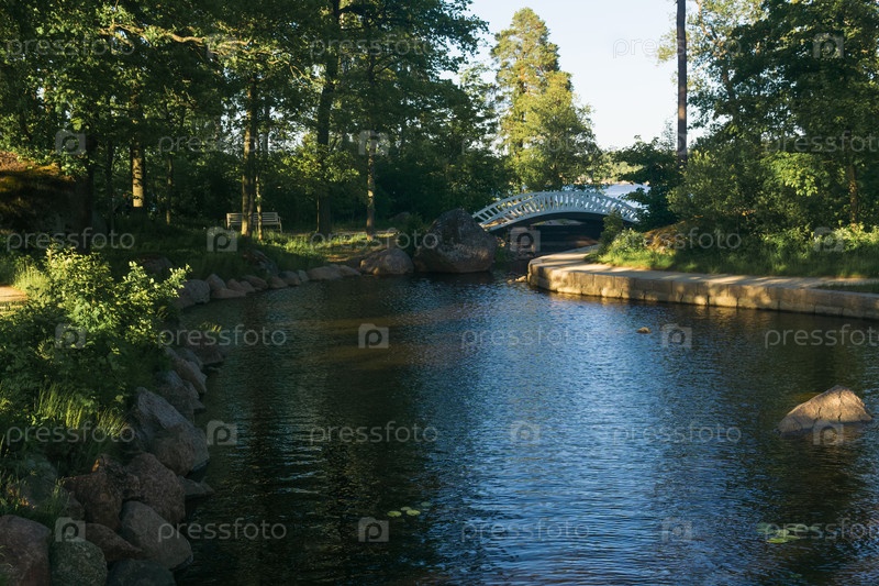 Арочный деревянный пешеходный мост в парке