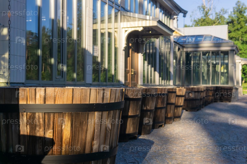 Деревянные горшки для цветов у стены оранжереи