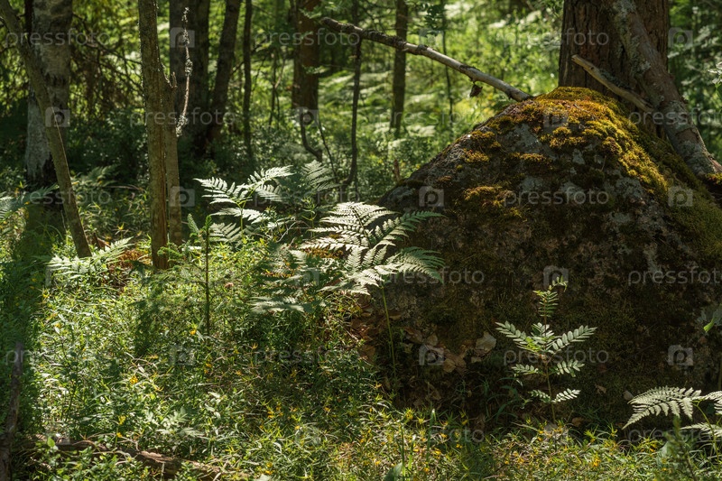Пейзаж с замшелым камнем среди леса