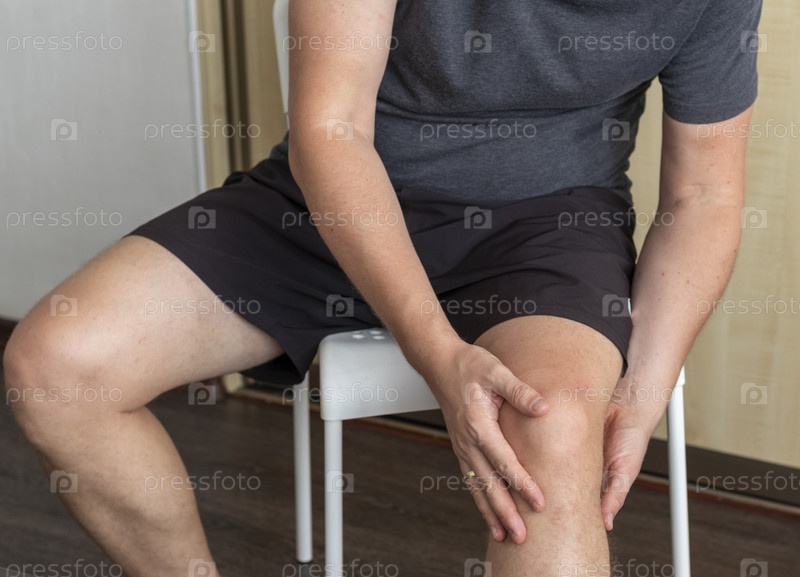 Снимок мужчины, сидящего на белом стуле и держащегося за колено руками, Здравоохранение