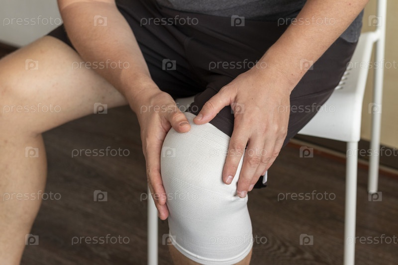 На снимке мужчина сидит на белом стуле, держась руками за колено, на правом колене эластичный бинт. Здравоохранение