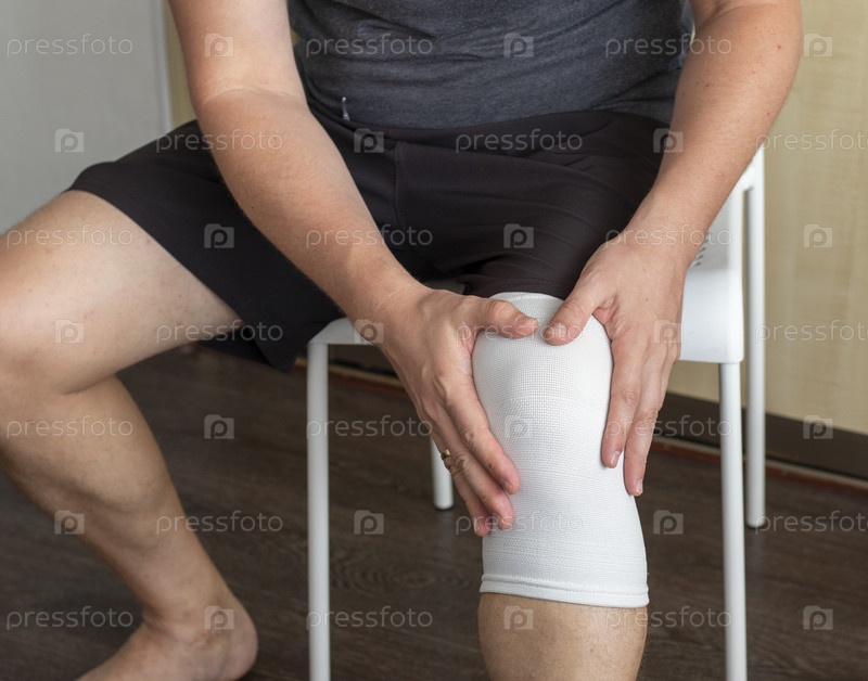 На снимке мужчина сидит на белом стуле, держась руками за колено, на правом колене эластичный бинт. Здравоохранение