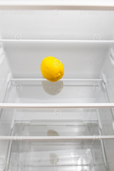 Холодильник с одним лимоном на стеклянной полке