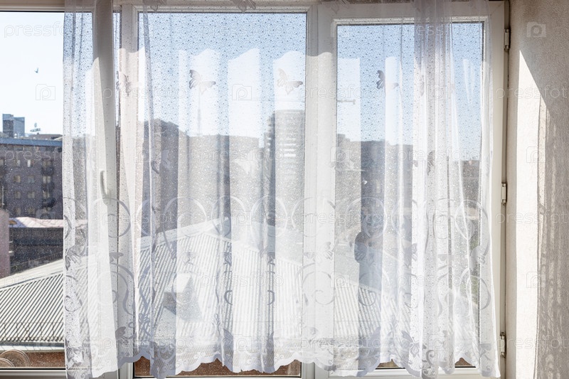 Тюлевые занавески на окне дома и вид на крышу