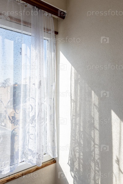 Тюлевые занавески на окне и стене дома, освещенные солнцем