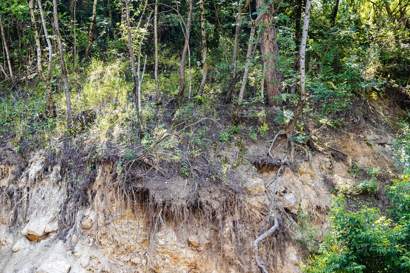 Корни деревьев на осыпающемся склоне оврага