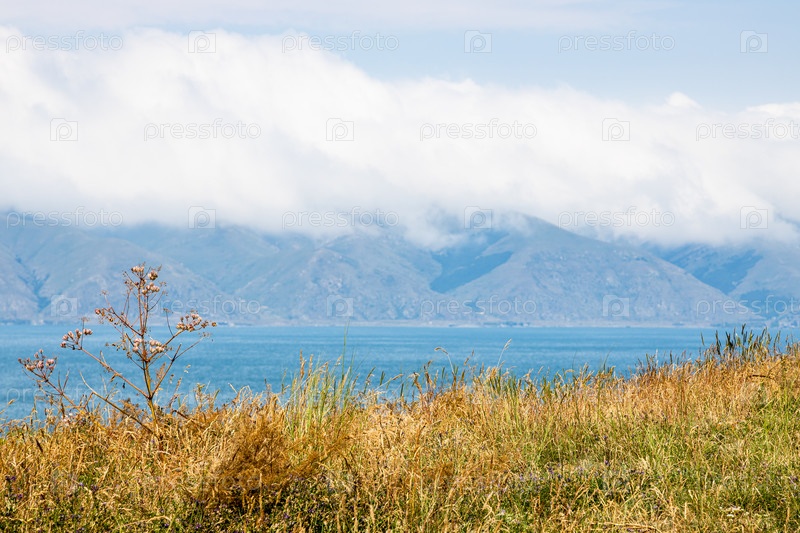 Выжженная солнцем трава и облако на горном берегу озера