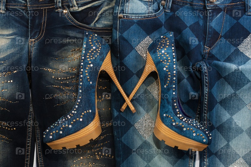 Гламурная женская мода, джинсы, туфли в стразах, лежа на джинсах