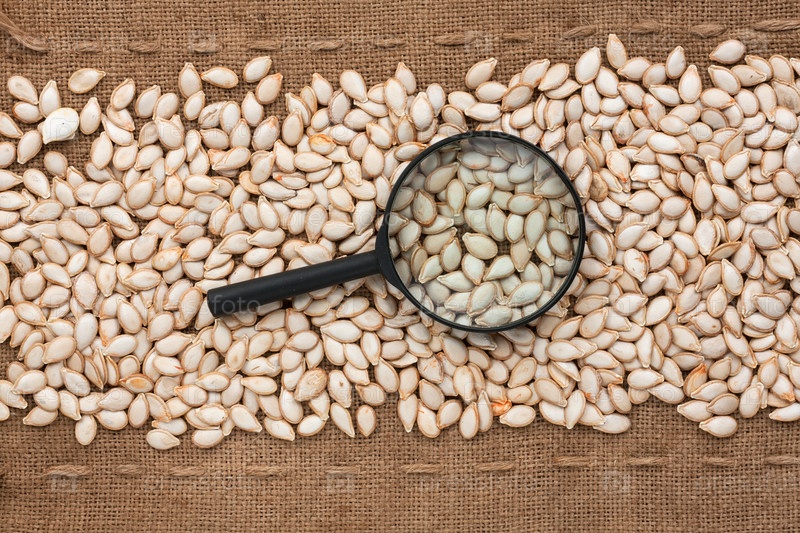 Увеличительное стекло лежит на семенах тыквы и мешковине