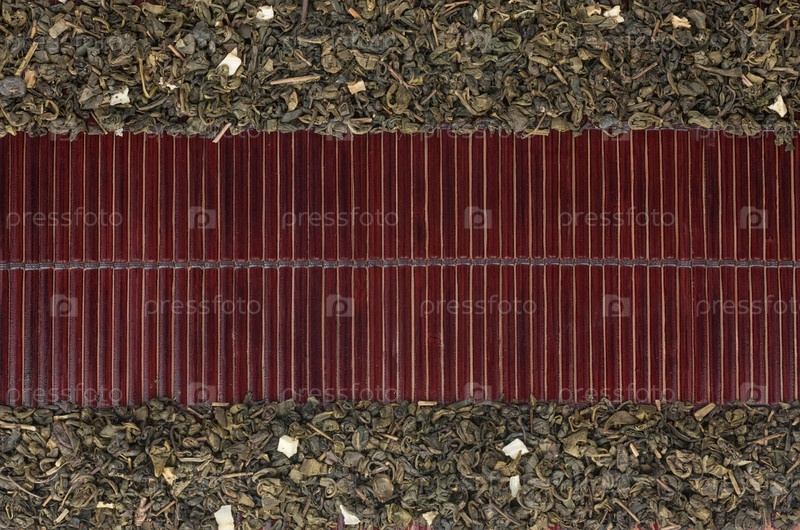 Сушеный зеленый чай на темном бамбуковом коврике