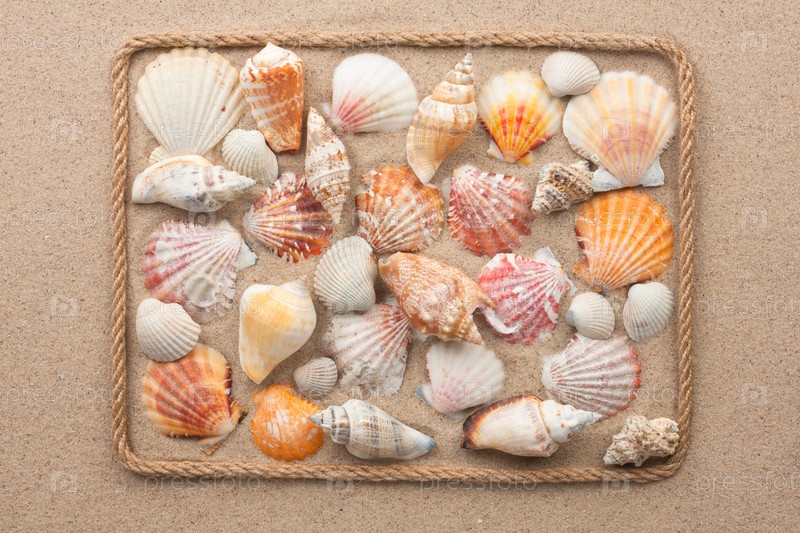 Красивая рамка из веревки и ракушек на песке