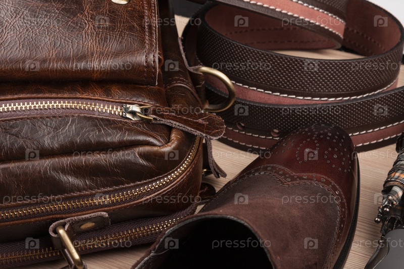 Шикарные классические коричневые туфли, ремень, зонтик и портфель на деревянном полу