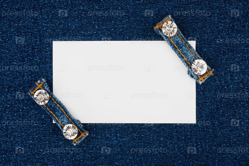 Визитная карточка с двумя бретелями, джинсы со стразами, лежит на джинсовой ткани