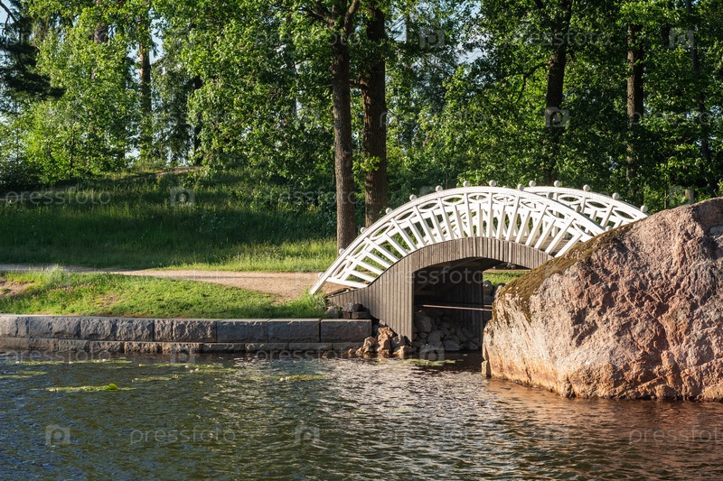 Арочный деревянный пешеходный мост в парке
